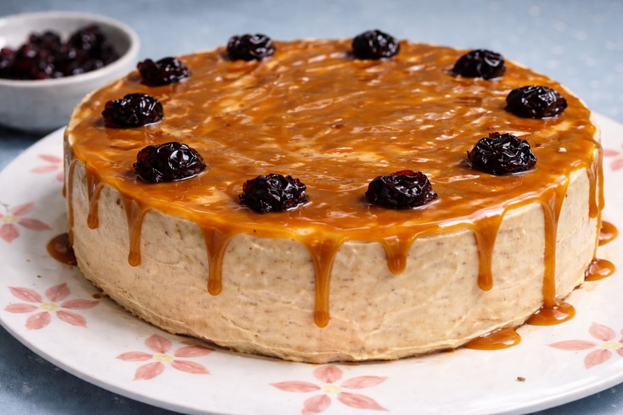 On top, I heated the remaining dulce de leche in the microwave, spread it out, and decorated it with cherries.